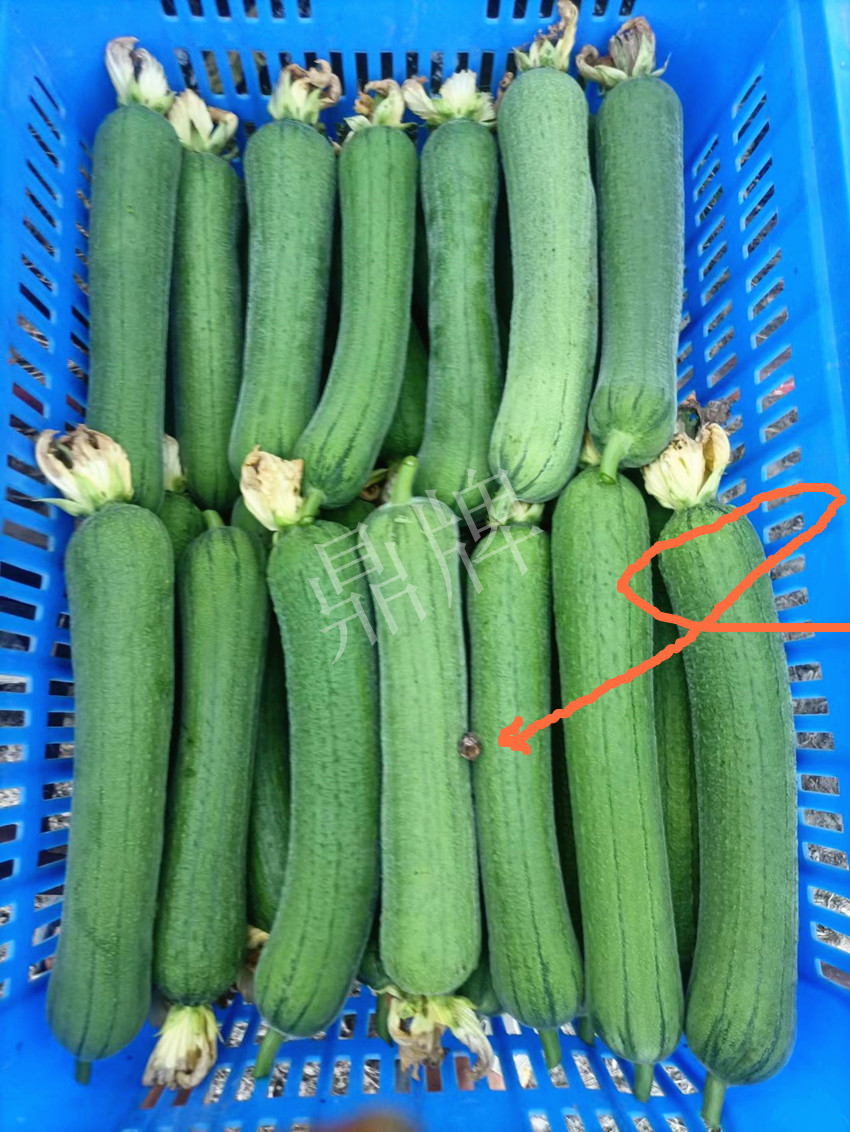 ▲ 裝入框中的“優(yōu)比1號(hào)”絲瓜。請(qǐng)看紅箭頭…
