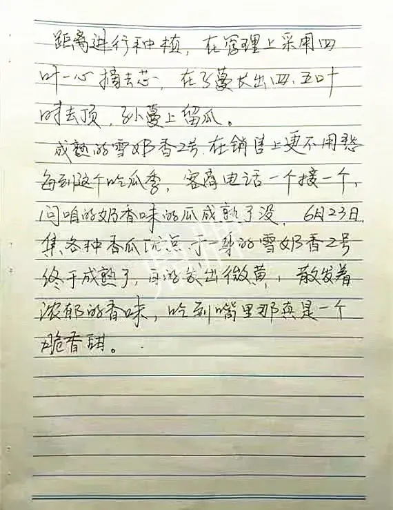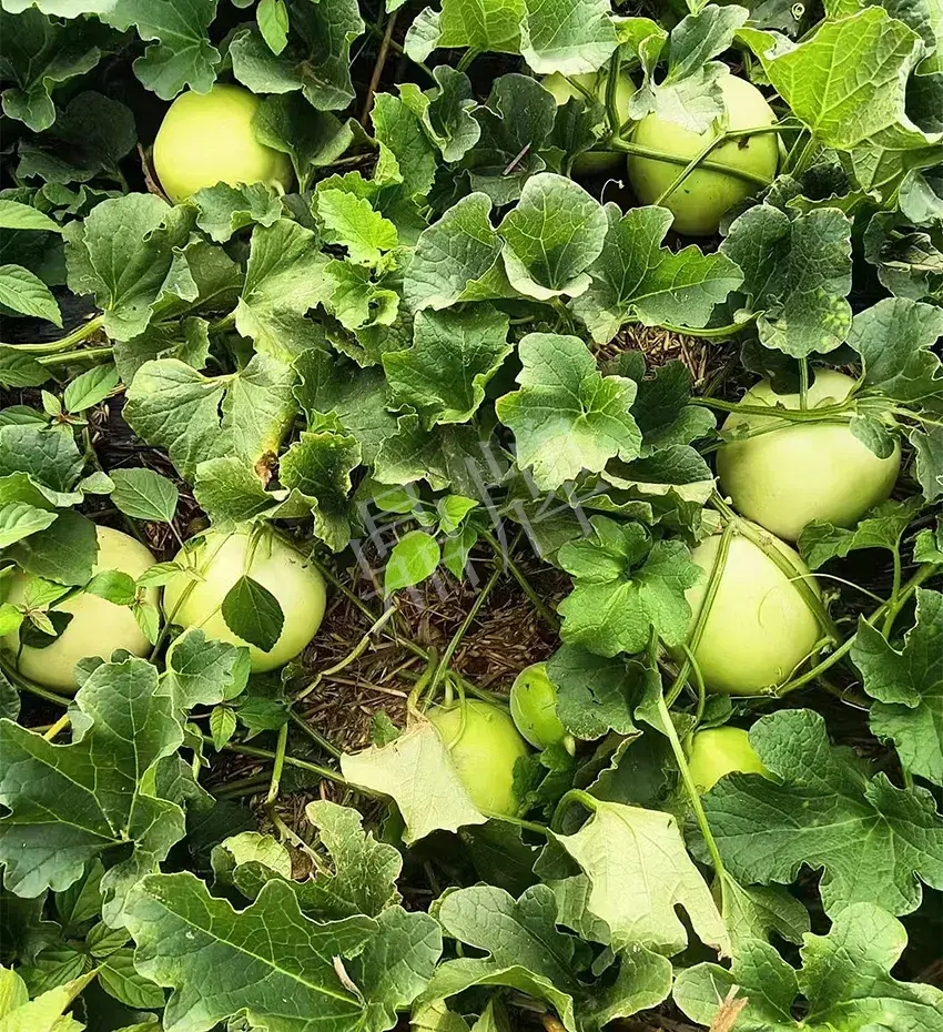 我今年種植的是鼎牌公司2023年推出的新品種雪奶香2號,雪奶香2號是1號的升級版,肉更厚、更甜的新品種。我們這里都是麥田套種,采用行距1.9米,株距七十公分的距離進(jìn)行種植,在管理上采用四葉一心摘去芯,在子蔓長出四、五葉時(shí)去頂,孫蔓上留瓜。