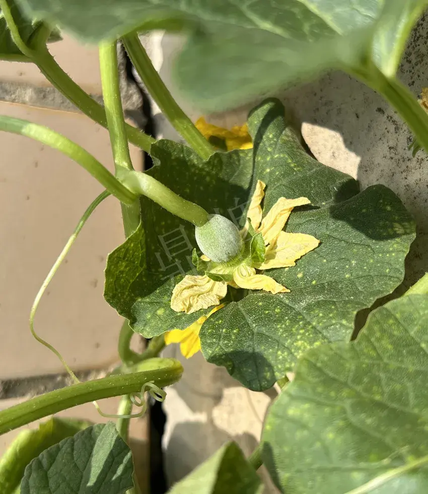 以下照片拍攝于8月29日下午3:42分,當(dāng)時的氣溫30℃,最高氣溫31℃。離上次拍攝只有幾天時間,這個時候的甜瓜葉片變得綠油油的了,上次結(jié)的瓜也長大了,并且又結(jié)了不少小瓜(沒有進行人工授粉,也沒有使用“氯吡脲”,發(fā)現(xiàn)有螞蟻在幫助傳粉)。