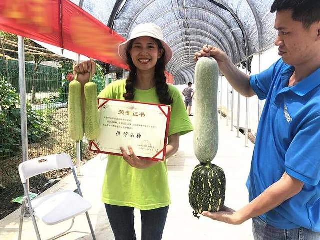 ▲ 客戶在展示“優(yōu)香1號”絲瓜,